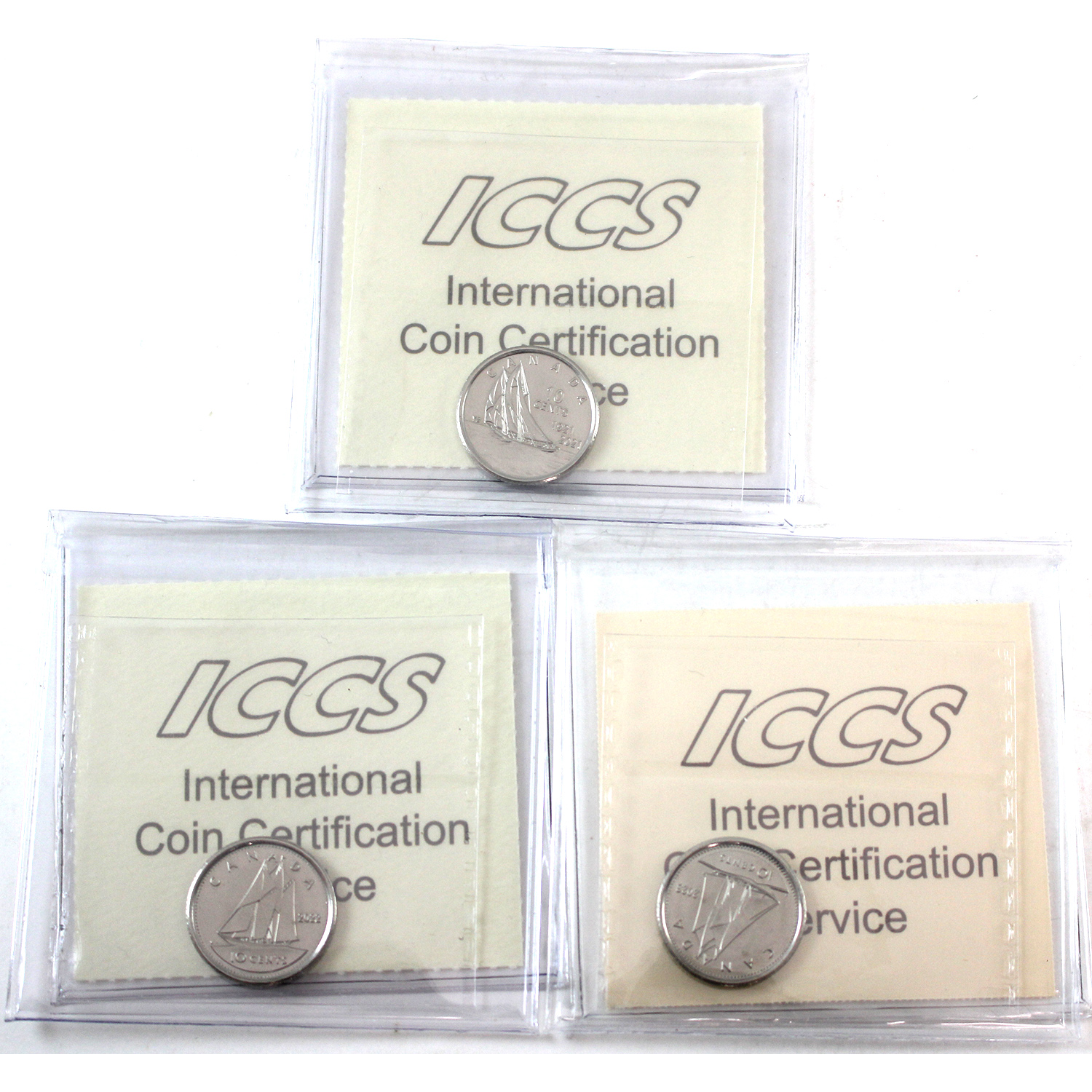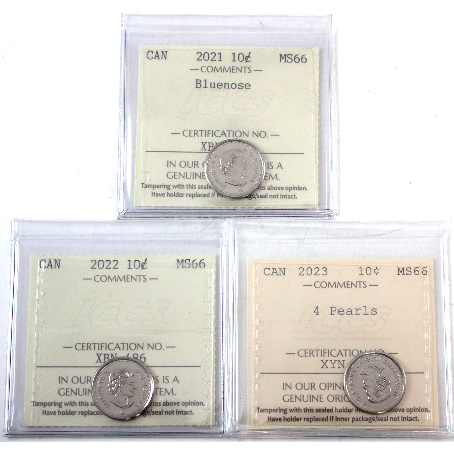 10-cent 2021, 2022 & 2023 4 Pearls ICCS MS66. 3pcs.