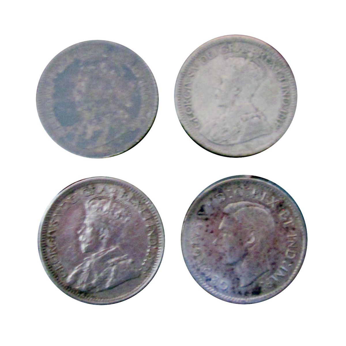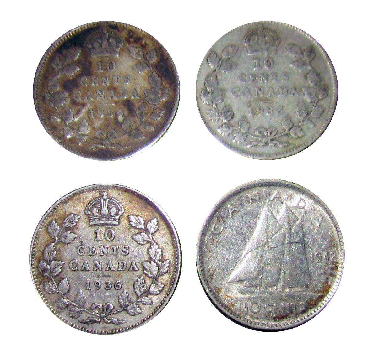 10 cents 1934 in F-12, 1935 in F-12, 1936 in F-12, 1942 in AU-50. Lot of 4 coins.