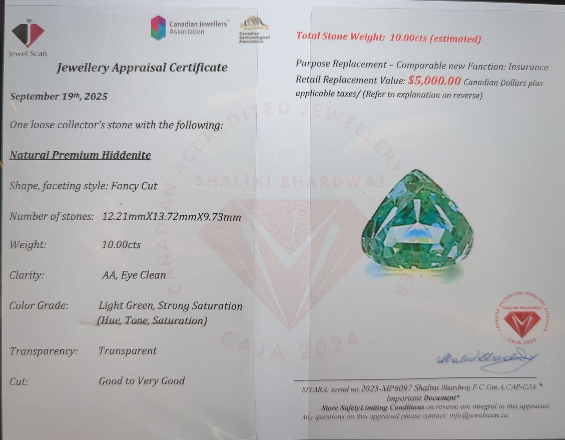 10 ct Certified Metallic Green Hiddenite gemstone ($5,000 Appraisal)