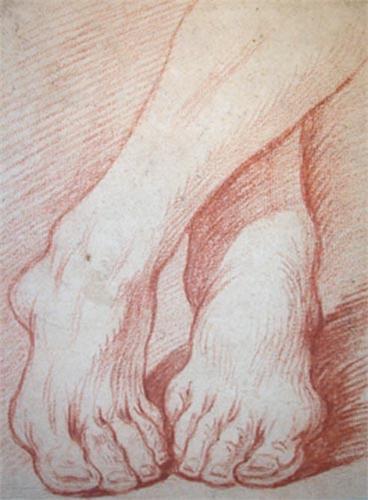 Scène de maternité avec la Vierge à l'Enfant et Sainte Elisabeth avec Saint Jean-Baptiste (d'après Biggioli ?). Dessin à la plume d'encre brune, monté sur carton (150 x 120 mm).-- Homme de dos devant une table, lisant (d'après Carrache ?). Plume à l'encre brune (235 x 190 mm).-- Danseuse nue au tambourin (d'après Boucher). Grand dessin au crayon sur papier gris (415 x 250 mm).-- La Haine (d'après Charles le Brun). Plume à l'encre noire et lavis (95 x 67 mm).-- Étude de trois personnages masculins en extension de force. Pierre noire (210 x 210 mm).-- L'éducation de la Vierge. Pierre noire et mise au carreau à la sanguine (297 x 203 mm)-- 3 études académiques de pieds et de jambes, dans le style de Greuze ou Watteau. Sanguines montées sur cartons (formats divers).-- Études d'une main et d'une manchette (recto), d'une Diane et d'une Dame (au verso). Pierre noire et traces de craie blanche sur papier gris-bleu (320 x 200 mm).
