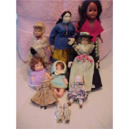 The tallest doll is plastic and like new. Probably dressed as a Mexican. The India doll is wonderful and on a base that says India. Underneath it says received from India Jan. 8, 1971. The lady in the black dress is in the style of the Italian dolls as it is felt and in good condition except her apron has some pin point holes. The twins in crocheted dresses are vinyl and in excellent condition. The Dutch girl appears to be composition and is adorable with no damage. The all bisque in the flowered dress has had her head glued on but it is hard to tell. She is adorable and in good condition otherwise. The dollhouse lady has problems. Her cloth body is patched and her head has been reglued on. The two little guys are Chester Gump and Skeezer, cartoon characters from the newspaper. They have bobbing heads and are in good condition except for missing paint. Make me an offer if not in an auction.