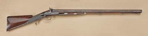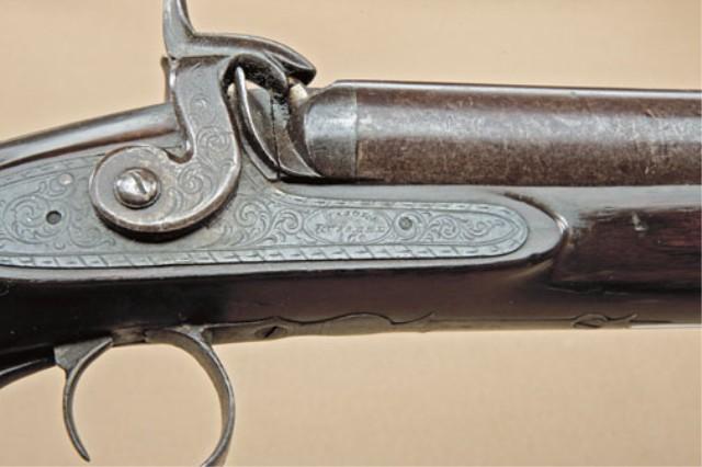 10-gauge side-by-side shotgun, engraved “Majors, Russel & Co.” on each lock. Barrel is hand-engraved London fine-twist. No British proofs. Approx. 48” overall, 31-1/2” barrels of 10ga, heavy construction with large reinforcing rib. The gun shows two barrel keys in German silver trim with engraved iron triggerguard and good quality checkered walnut stock. The gun shows a brown patina finish with traces of damascening, the rib shows old resoldering and repining at the breech. The stock has been lightly refinished and is generally good overall. The locks are working, and original to the period brass-tipped ramrod is included. The firm of Russel, Majors, and Waddell were freighters, stagecoach operators, and originators of the Pony Express. This gun appears American and this is the only known original marked specimen for Majors, Russell & Co. as the firm was only in business for two years and this marking is absolutely engraved at the time of the gun’s manufacture. Mr. Orbelo confirmed the Huntington Library and Wells Fargo museum curator that this is the only known marked specimen from this early stagecoach company, and an awesome self-defense weapon as it could be loaded with a