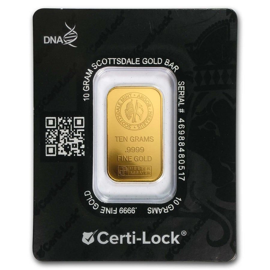 10 gram .9999 Fine Gold Bar - Scottsdale Mint (In Certi-Lock® Assay, Black)
