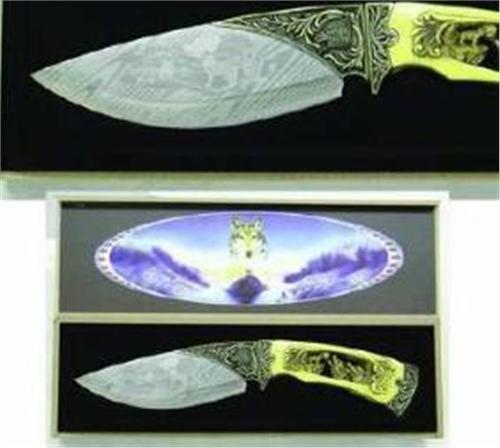 Overall Length: 10" Blade Length: 5" Wolf Scene on both sides of the Blade Handle Material: Laser Carved Faux Ivory with carved Wolf on both sides Trim is Antique Gold Finish Display Box: Wooden Presentation box with black Velvet Look lining