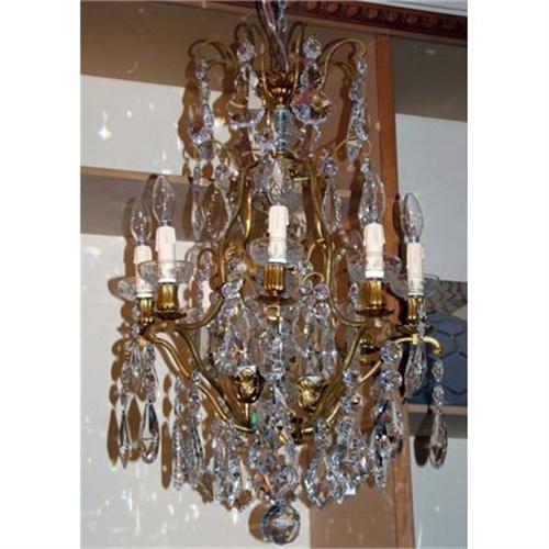 A beautiful French Chandelier, bronze frame and antique Bohemia lead crystal pendants, in very good conditions, rewired , measuring 31" H, and 20" wide.