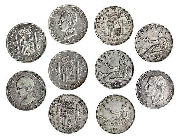 10 monedas de 2 pesetas. Gobierno Provisional a Alfonso XIII. De BC+ a EBC-.