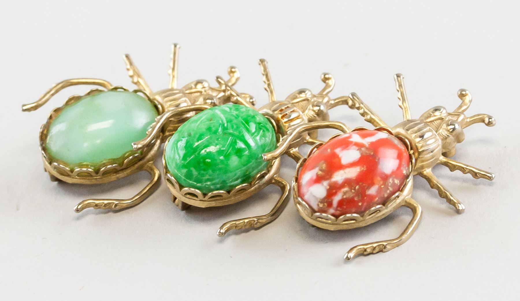 10 pcs group of assorted jewellery. Featuring three beetle shaped brooches, set with red and green stones, four gemstone rings, and three pairs of gemstone earrings. Rings with "18 K" "10 K Gold" marked on the inner side of the band. 51 grams in total.