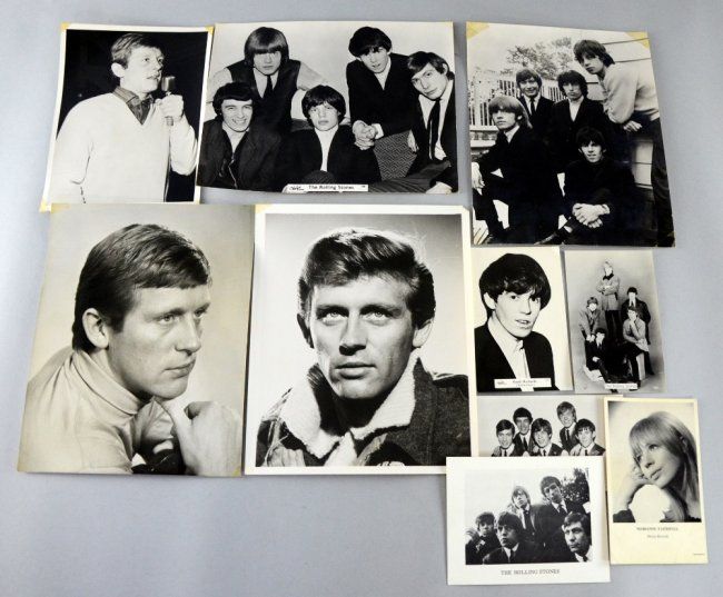 10 photographs of pop stars including 'The Rolling Stones' Radio Times photograph (Silver Gelatin), Rolling Stones Valex Blackpool photograph and four others of the Stones, one Decca promo card with facsimile signatures of The Rolling Stones including Brian Jones. Also including a Decca Records promotional photo of Marianne Faithfull with record catalogue listing up to May 1966. (10)