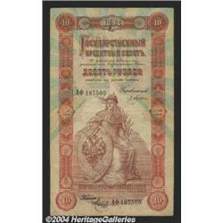 10 rubles 1894, Pick-A58. Fine-Very Fine. The paper is crisp and the edges show a minimum of wear on this vertical format 10 rubles from the reign of Czar Alexander III. This note has both vertical and horizontal folds. Important notice: Heritage usually auctions material at the rate of 200-250 lots per hour. On some occasions eBay Live bid software or the Internet may not be able to keep up with the pace of the auction. We recommend placing a realistic absentee bid now as insurance to avoid disappointment. Occasionally the auctioneer may eliminate or reject an eBay Live bid, and the auctioneer may also reopen a lot after the close of the eBay live bidding (usually because we missed an audience bid), and may reject your bid even if it shows you as the winning bidder. By bidding via eBay Live, you agree that Heritage may award the lot to another bidder at its sole discretion under the circumstances described above or any other reasonable circumstances. Also please note that all Heritage lots purchased through eBay Live carry a 20% Buyer's Premium. Please make sure you read the Terms and Conditions before you bid.