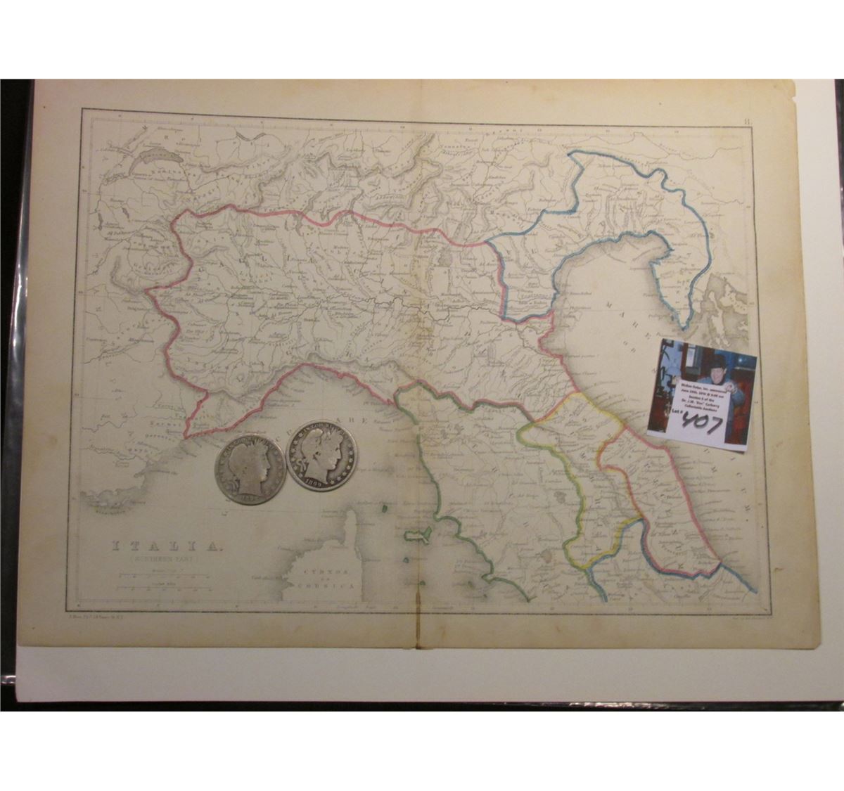 10" x 13" Map "Italia (Northern Part)", ready for framing; & 1898 P & 99 P Mint Barber Half Dollars in G-AG.