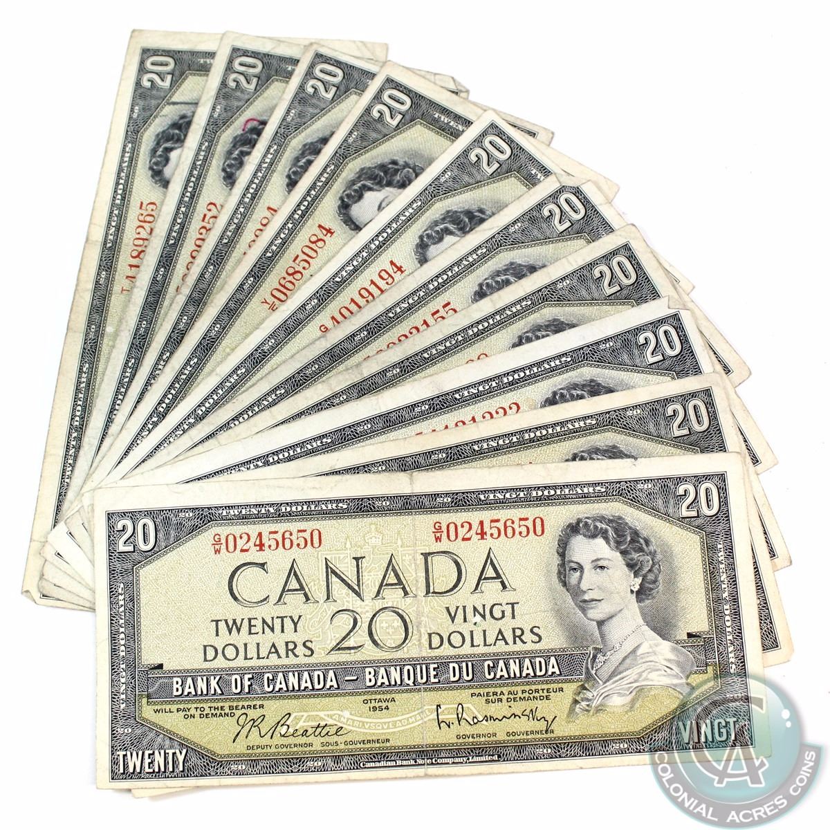 10 x 1954 Modified Portrait $20 Notes from the Bank of Canada. 10pcs