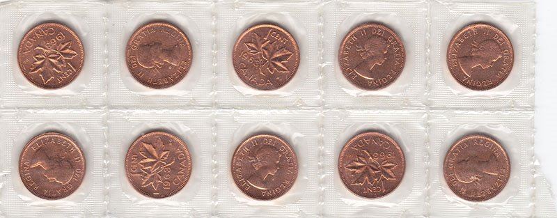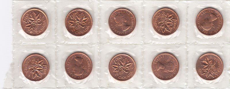 10 x 1963 Canadian Small One Cent Penny Coins - In Original Packaging As Received In Detergent in the 60's