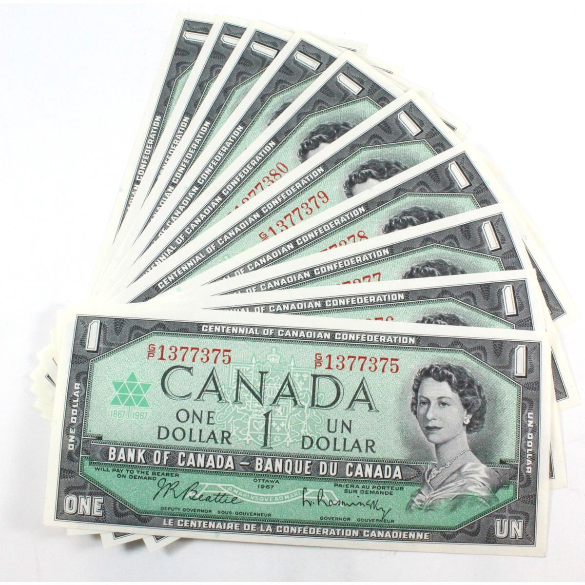 10 x 1967 $1.00 Notes, prefix G/P with Consecutive Serial Numbers in UNC Condition. Buyers Premium will be added on all items as per our terms of sale. We accept Paypal, Credit Card, E-Transfer Payments, Cheque or Money Orders (there is an additional 3% fee for using Paypal or Credit Card). All invoices will be emailed immediately following the auction, please contact us if you would like to pay by credit card or receive a new revised lower total for mailing in payment or sending an e-transfer (3% discount). All Items Are Sold "AS IS", no returns
