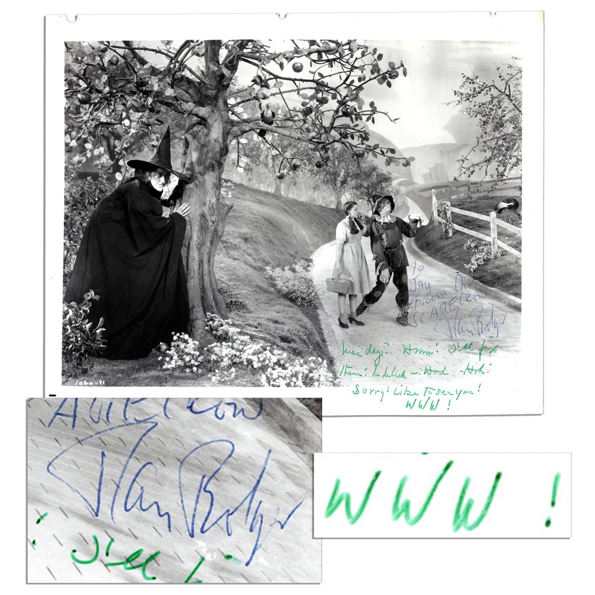 Fantastic 10'' x 8'' glossy photo of Dorothy, the Scarecrow and the Wicked Witch of the West, in a still from ''The Wizard of Oz''. Signed in blue ballpoint, ''To Jay from The Scarecrow / Ray Bolger'' and in green felt tip, ''Nice day? Hmm! I'll fix them! He He Huh - Hah Hah! Sorry! Like to see you! WWW!'' Light rippling to top and right edged, and partial three hole punches along top edge. Overall in very good to near fine condition.
