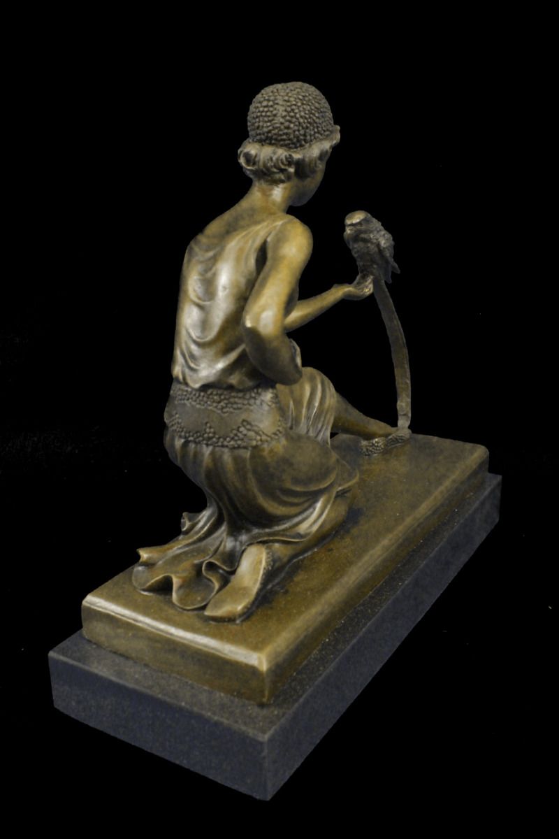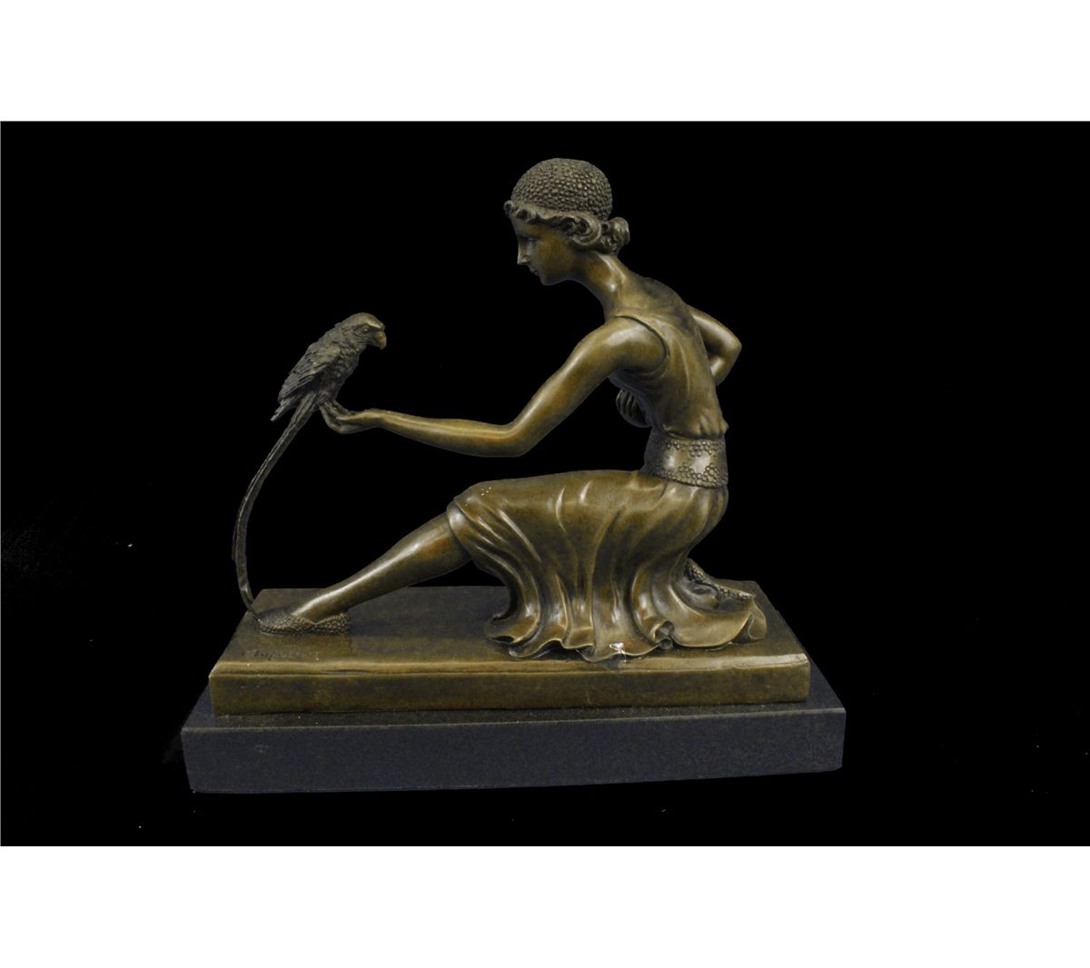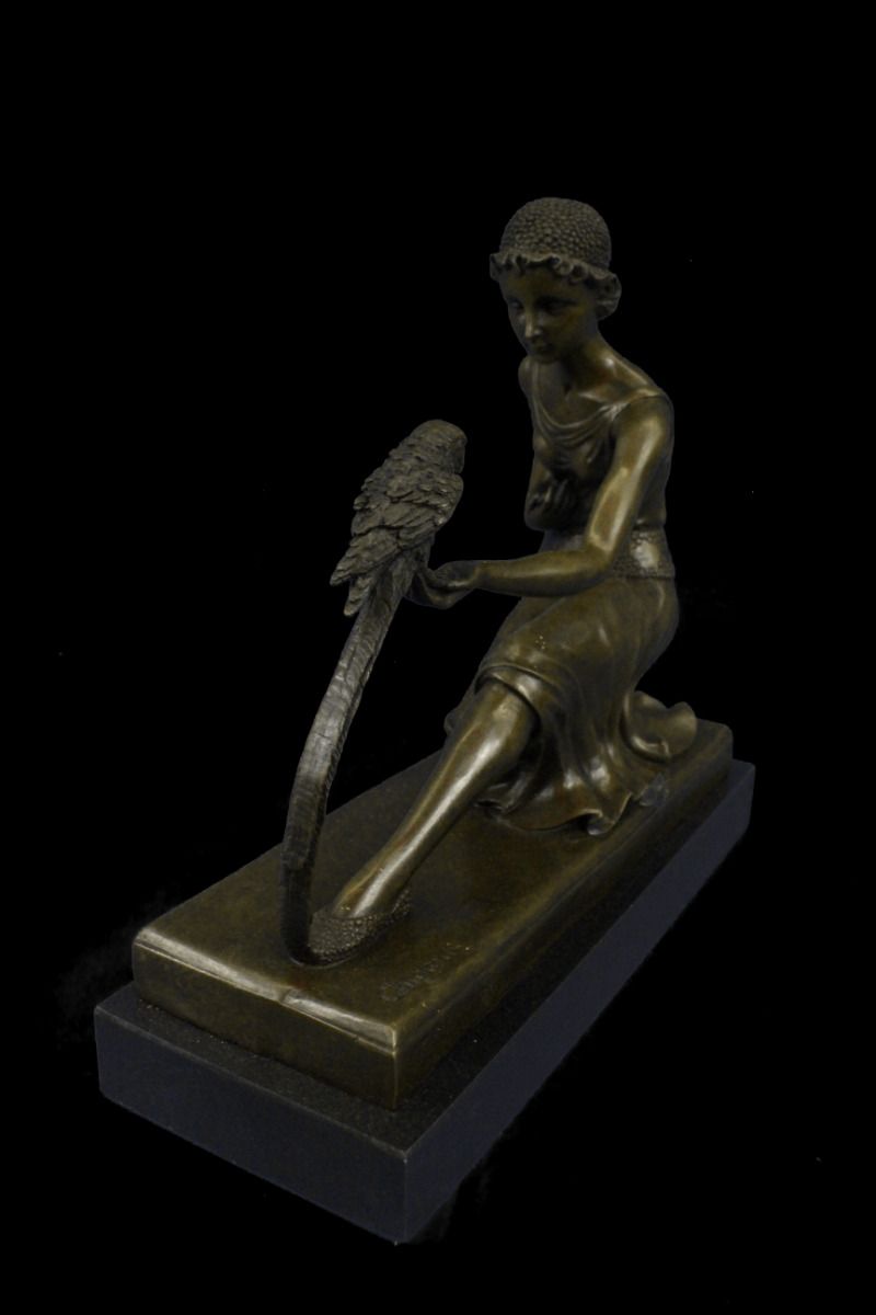 11DS14880 She is a elegant bird whisperer. A well-dressed young woman on her way to a ritzy night out, steals a moment to play with a exotic parrot. She kneels down in her evening dress and holds a welcoming hand out. The friendly parrot lands on her fingertips and searches her palm for seeds. She hides fruits in her other hand and cradles it to her chest. She is finely dressed in a long dress with a beaded belt and matching studded hat. 100% bronze and handmade, this brown patina sculpture was cast using the "Lost Wax Method" and mounted on a black marble base and is signed Chiaparus...................SHIPPING USA: $20....HI, ALASKA, CANADA: $49...ALL OTHER COUNTRIES: $89