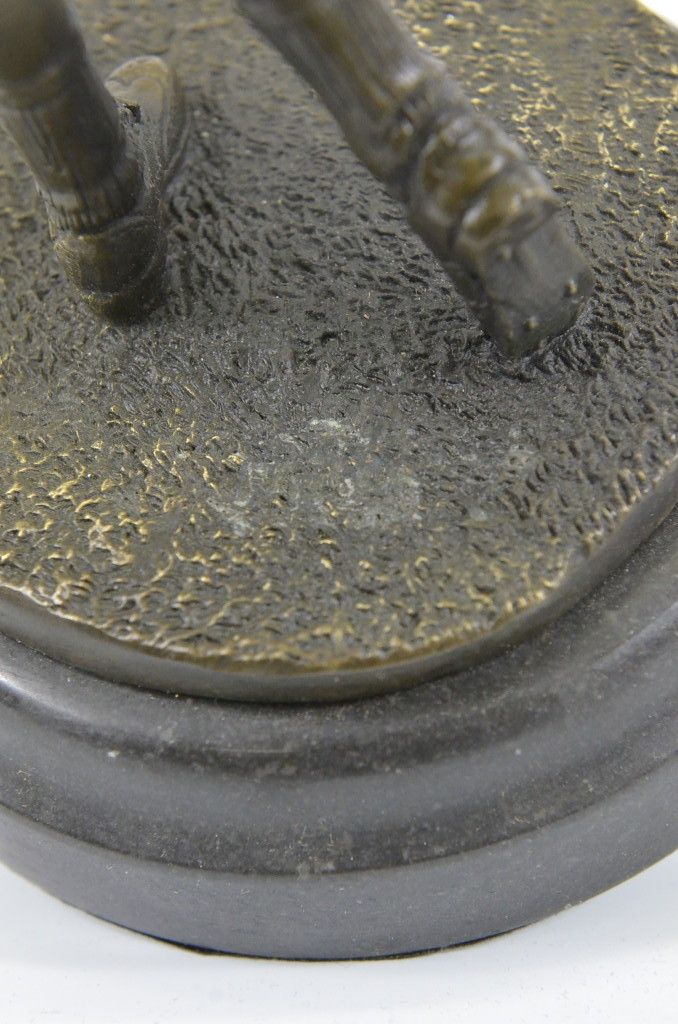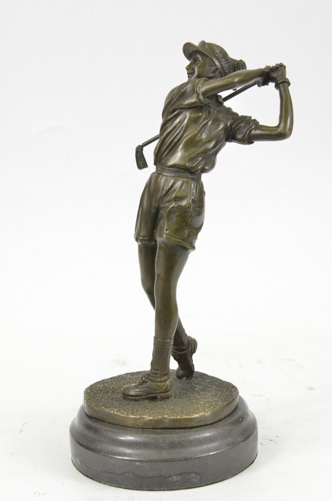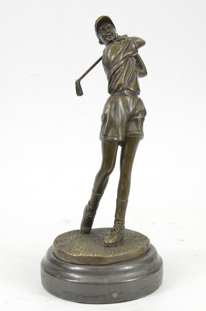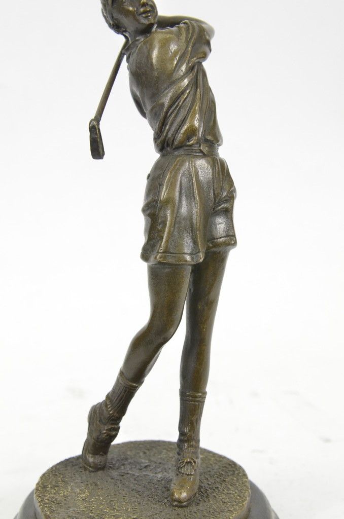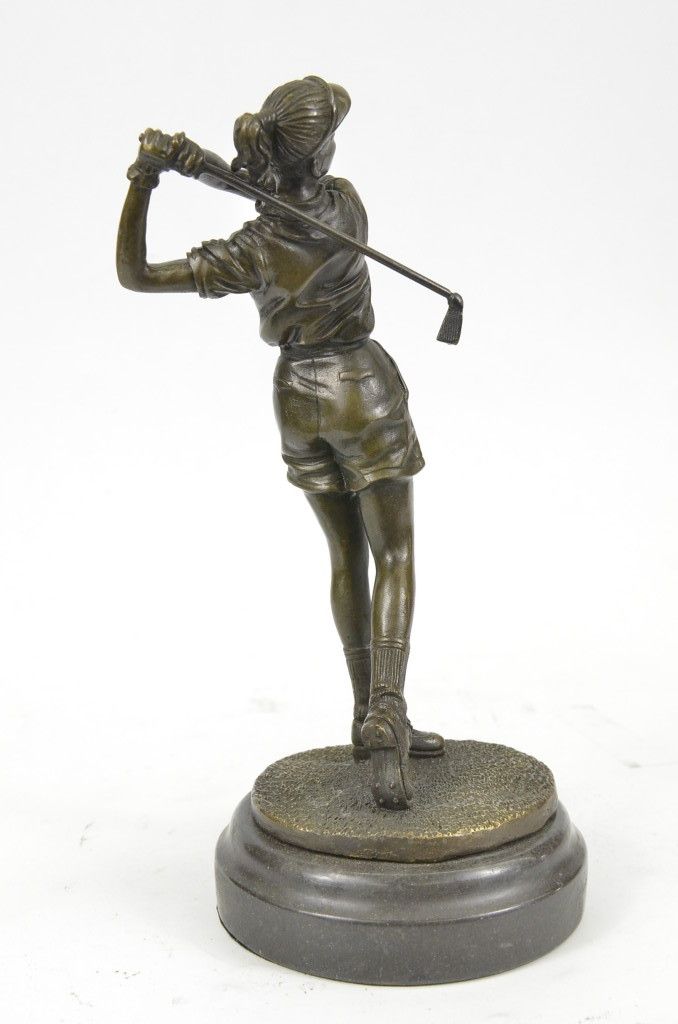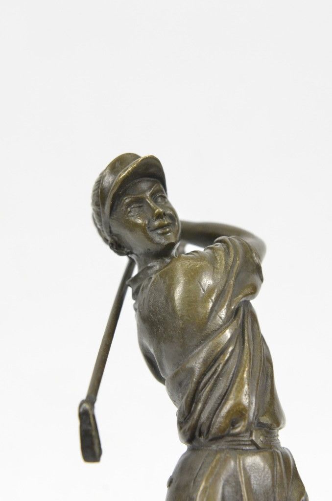 11YRD78480 A Golfer Tilts Her Head Up To The Sun And Watches Her Ball Rise. She Holds Her Form And Stance, Tracking The Position Of The Ball And How Close To The Green It May Land. Her Body Twists With Her Stroke. In Her Head She Counts The Strokes She May Need If It Doesn'T Land On The Green And How Many She May Need If It Does. She Silently Prays That It Doesn'T Land In A Sand Trap Or Near A Water Hazard. Though The Crowd Has Already Begun To Erupt In An Uproar, She Knows It'S Too Soon For Celebration. The Ball Is Left To The Wind. She Wears A Cotton Tee Shirt, Skirt, And Cap. There Are Fine Details To Appreciate Like The Ripples Of Her Moving Clothes And The Rough Patches Of The Manicured Grass. This Handmade 100% Bronze Sculpture Was Cast Using The "Lost Wax Method" And Mounted On A Marble Base And Is Signed Milo...................SHIPPING USA: $15....HI, ALASKA, CANADA: $35...ALL OTHER COUNTRIES: $59