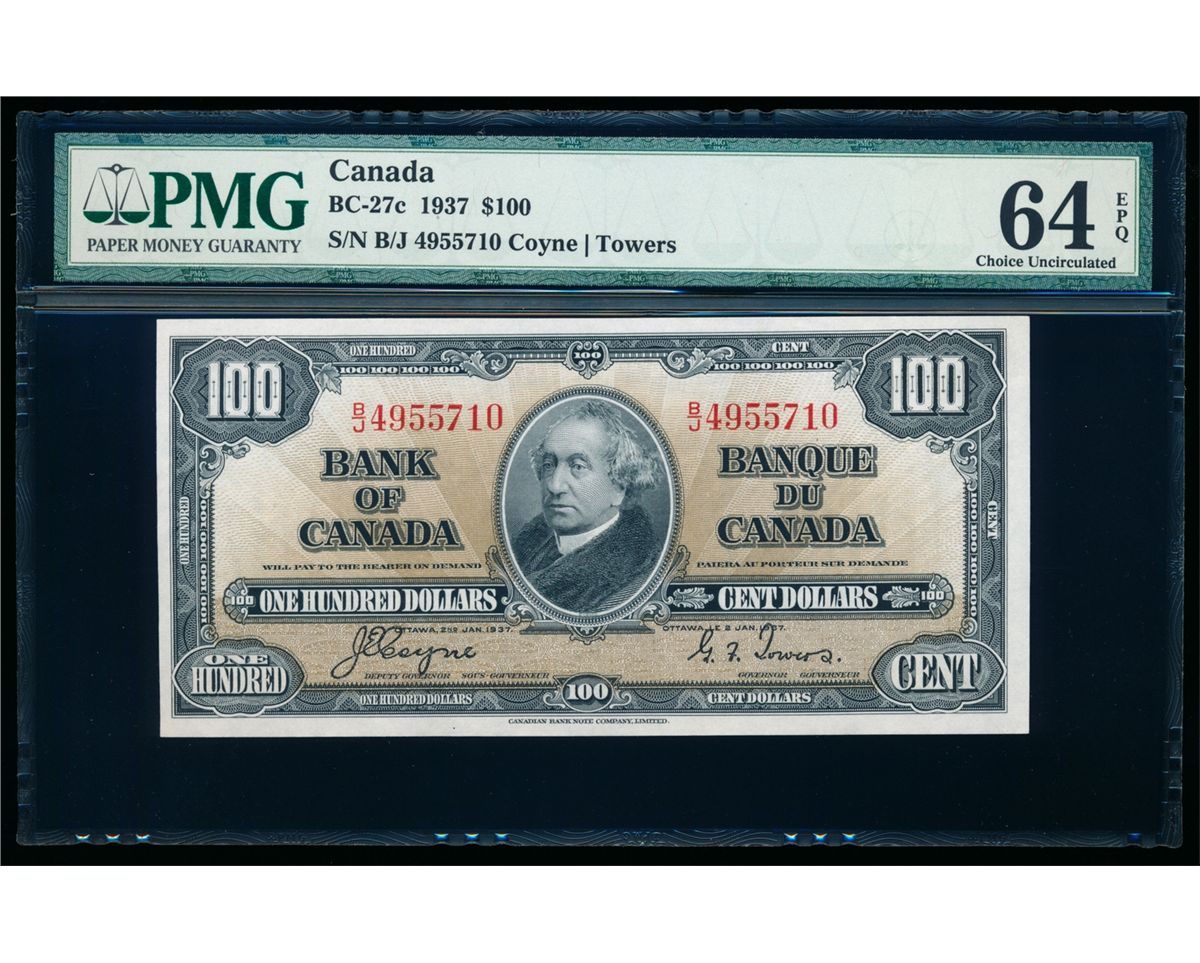 $100.00. 1937. BC-27c. Coyne-Towers. No.B/J4955710. PMG graded Very Choice Uncirculated-64 EPQ.
