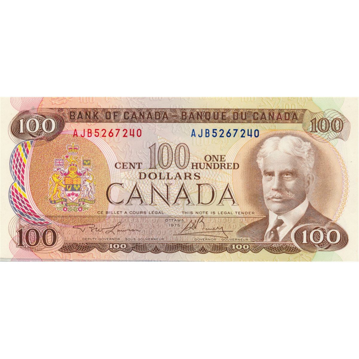 $100.00. 1975 Issue. BC-52a-i. Lawson-Bouey. No. AJB5267240. CCCS graded Gem UNC-65.