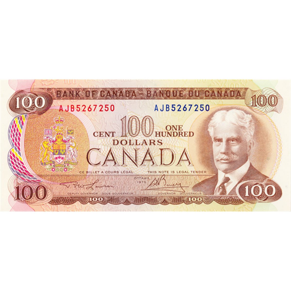 $100.00. 1975 Issue. BC-52a-i. Lawson-Bouey. No. AJB5267250. CCCS graded Gem UNC-65.