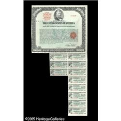 <B>$100,000 U.S Treasury Bearer Bond.</B></I> A second $100,000 U.S. Treasury bearer bond from the same issue as the preceding two bonds, the thirty year 7 5/8% of February, 1977. This issue was called on February, 15, 2002, although the bond is fully redeemable at its face value until 2047. There are 11 coupons remaining affixed to the bond, along with a penciled number and a machine placed number on the front of the instrument. Lot:15549