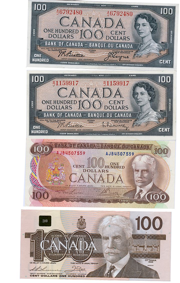 1954 Issue. BC-43a. Beattie-Coyne. No. A/J6792480. VF; $100.00. 1954 Issue. BC-43b. Beattie-Rasminsky. No. B/J1159917. AU; $100.00. 1975 Issue. BC-52a-i. Lawson-Bouey. No. AJB4507559. EF; $100.00. 1988 Issue. BC-60aA-i. Thiessen-Crow. No. AJX3380135. EF. Lot of four (4) notes.