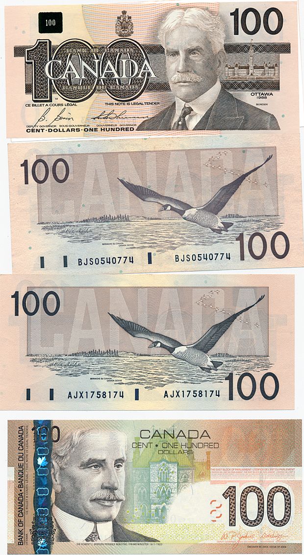 1988 Issue. BC-60aA. Thiessen-Crow. No. AJX1758174. $100.00. 1988 Issue. BC-60b. Bonin-Thiessen. No. BJN7321693; $100.00. 1988 Issue. BC-60d. Knight-Dodge. No. BJS0540774. EF; $100.00. 2003 Issue. BC-66a-i. Jenkins-Dodge. No. EJA3343675. Unc. Lot of four (4) notes.