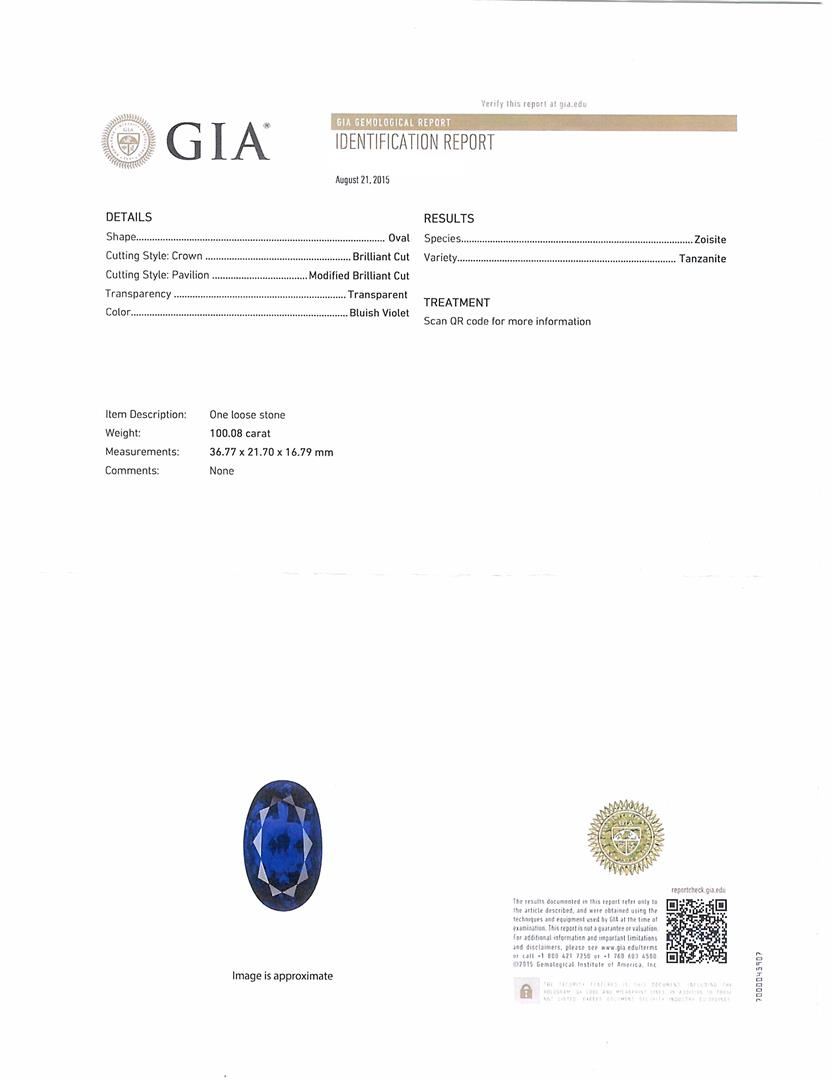One loose oval modified brilliant cut tanzanite stone, measuring 36.77mm x 21.70mm x 16.79mm and weighing 100.08ct. The stone is transparent and bluish violet in color. Graded loose by GIA, report number 1205666811. GIA Appraised.