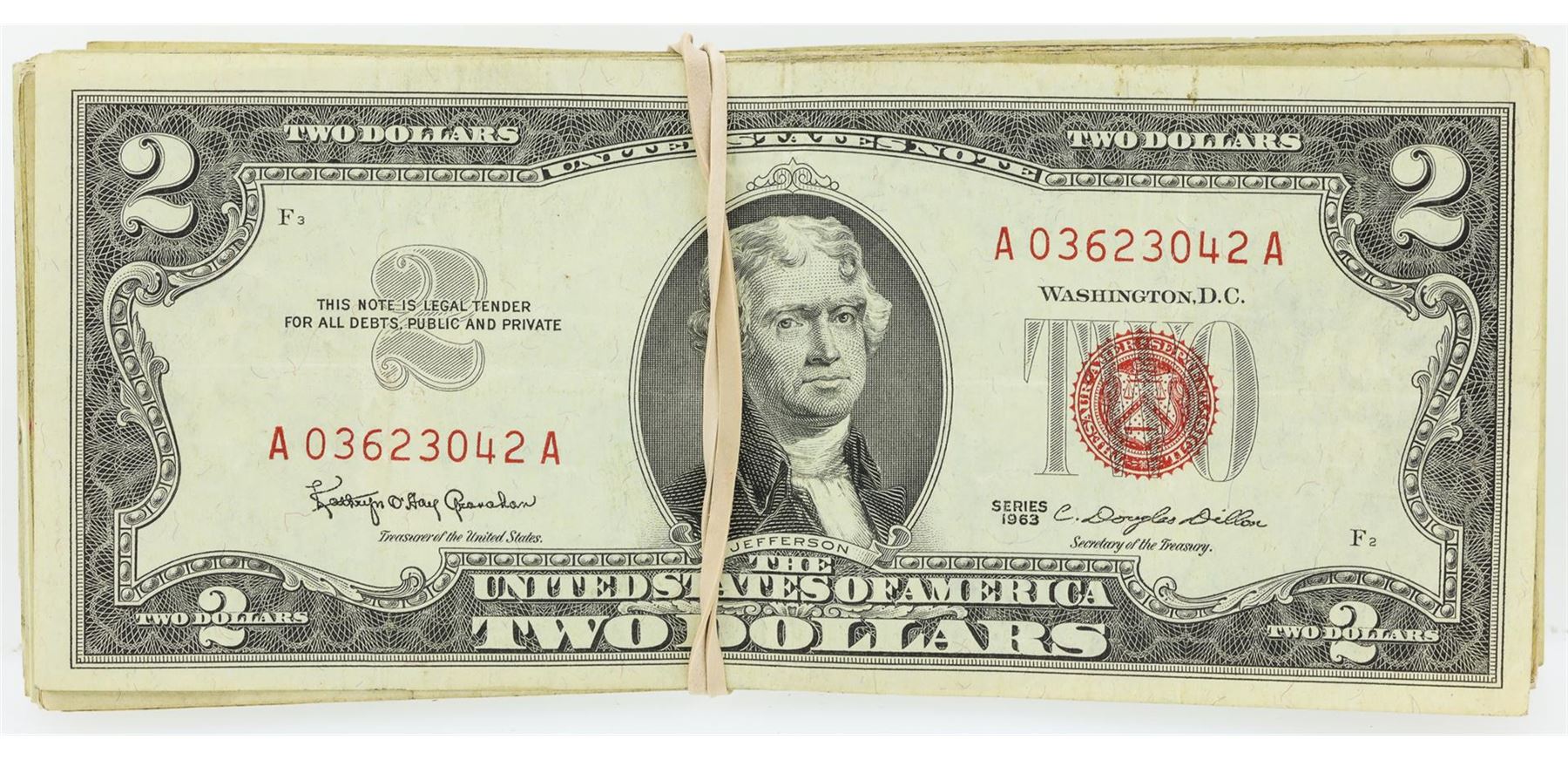 A lot of (100) 1963 $2 Red Seal Legal Tender Notes Circulated