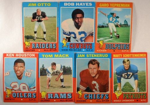Includes: Marty Schottenheimer (R), Jan Stenerud, Tom Mack, Ken Houston (R), Garo Yepremian (R), Jim Otto, Bob Hayes. Book Value $160.00.