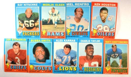 Includes: Marty Schottenheimer (R), Charlie Taylor Alex Karras, Bubba Smith, Jan Stenerud, Ken Houston (R), Mel Renfro, Merlin Olsen, Ray Nitschke. Book Value $167.00.