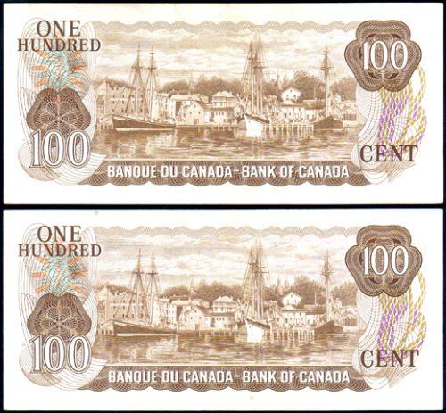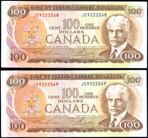 Bank of Canada One Hundred Dollars 1975, Lawson Bouey BC-52a, two Consecutive Serial Numbers JC9222568 and 569, EF and better