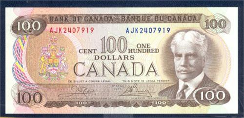 Bank of Canada; $100 1975, BC-52b, UNC, signature Crow Bouey, serial # AJK2407919.