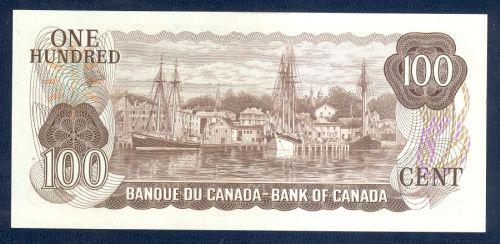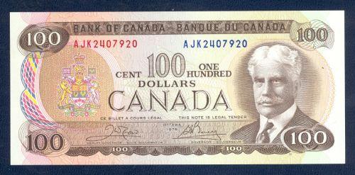 Bank of Canada; $100 1975, BC-52b, UNC, signature Crow Bouey, serial # AJK2407920.