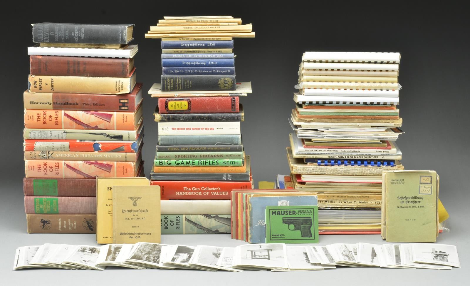 100+ Book & 40+ manuals/small books related to firearms. Notable examples include: Small Arms of the World. / Cartridges of the World. / Gunsmith Kinks. / Vol. 11 Handbook for shooters & handloaders by PO Ackley. / The MAuser Self-Load Pistol. / Mauser Pocket Pistols 1910-1916. / System Mauser. / A Basic Manual of Military Small Arms. / Hornady Handbook. / Rock Island Rifle Model 1903 by C.S.Ferris. / & notable sm. Mauser advertising booklets in German. CONDITION: most books are in acceptable used condition w/ wear, flexing, tears to dust jackets. (02-16954-10/MD). $50-100.