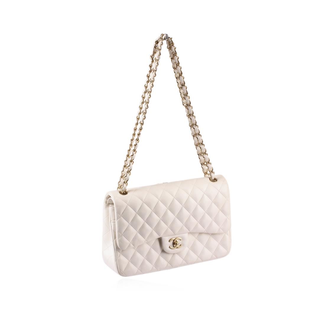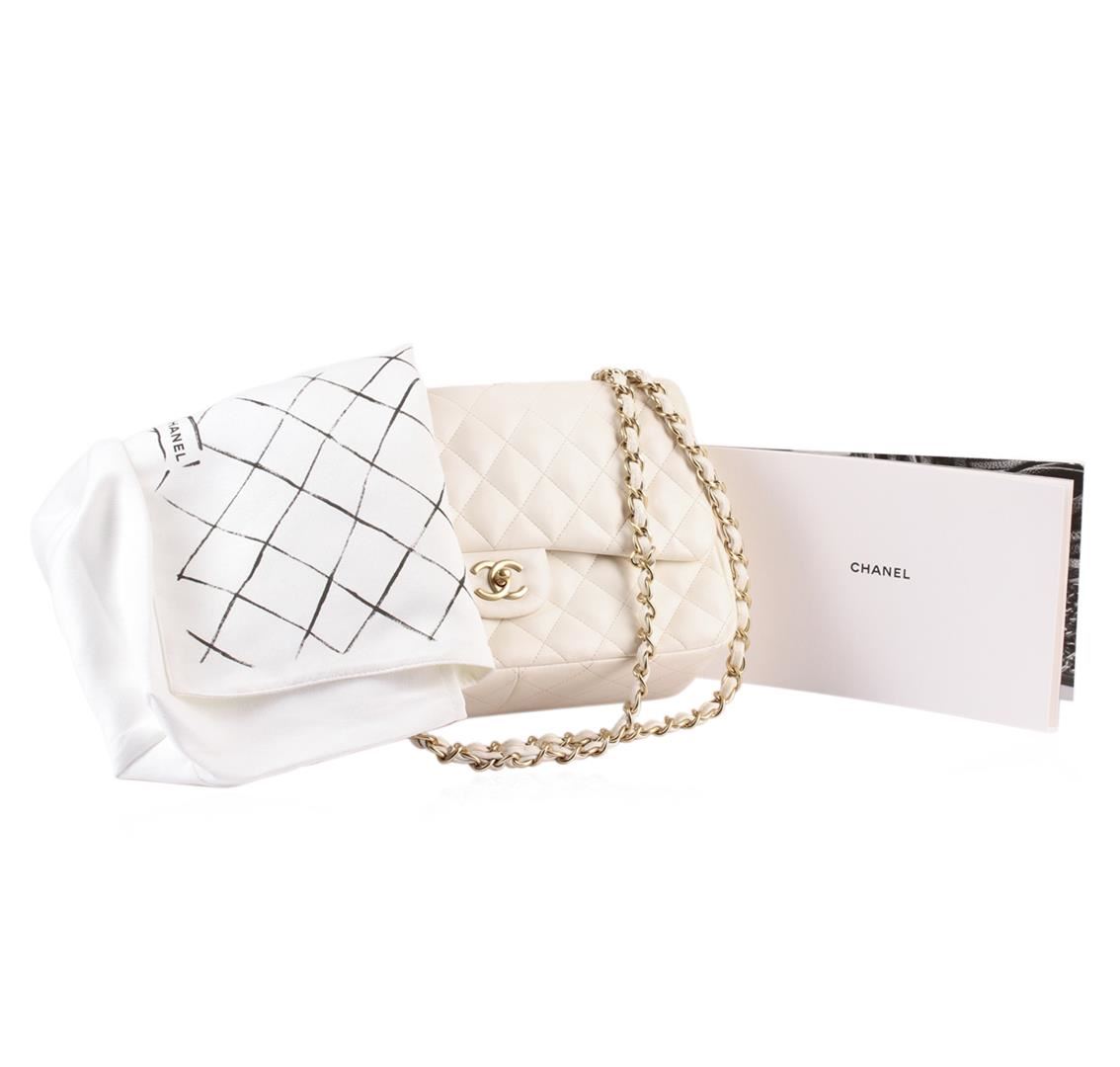Up for auction is this remarkable Chanel Flap Bag in gorgeous white lambskin leather with gold-tone hardware. The classic Chanel Flap Bag is as iconic as it is timeless and is often referred to as the 2.55 bag in reference to it's release in February of 1955. Somehow, the Chanel Flap bag is even more popular today than it was in 1955. This elegant Jumbo Flap is one of the larger flap bags made and features a gorgeous double flap design. The interior flap showcases a stitched interlocking-C logo plus "Chanel made in Italy" stamped in gold. Here you will also find several pockets and compartments to easily store and organize all your daily necessities. This double flap Chanel bag is crafted in diamond quilted lambskin leather with iconic gold "CC" lock closure. It also offers adjustable chain link straps, gold hardware and is the perfect luxury accessory to complement both casual and sophisticated looks. Exterior shows some signs of wear, please see pictures, but interior is in pristine condition. Hologram sticker is intact. Was purchased from Saks Fifth Avenue store in Beverly Hills, Ca. This Classic Chanel Jumbo Flap Bag in White Lambskin comes complete with the Limited edition white Chanel dust bag which features the iconic Chanel quilting pattern, a portrait of Coco Chanel and Karl Lagerfeld's name. Also accompanying this must-have bag is the original authenticity card, retail upc tag, Chanel care booklet, Chanel flap bag booklet, Chanel ribbon & Chanel fabric flower sticker. Trust us, you don't want to miss your chance town this exquisite Chanel bag!