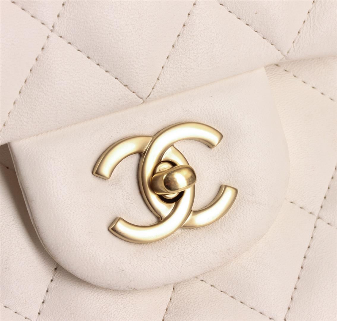 Up for auction is this remarkable Chanel Flap Bag in gorgeous white lambskin leather with gold-tone hardware. The classic Chanel Flap Bag is as iconic as it is timeless and is often referred to as the 2.55 bag in reference to it's release in February of 1955. Somehow, the Chanel Flap bag is even more popular today than it was in 1955. This elegant Jumbo Flap is one of the larger flap bags made and features a gorgeous double flap design. The interior flap showcases a stitched interlocking-C logo plus "Chanel made in Italy" stamped in gold. Here you will also find several pockets and compartments to easily store and organize all your daily necessities. This double flap Chanel bag is crafted in diamond quilted lambskin leather with iconic gold "CC" lock closure. It also offers adjustable chain link straps, gold hardware and is the perfect luxury accessory to complement both casual and sophisticated looks. Exterior shows some signs of wear, please see pictures, but interior is in pristine condition. Hologram sticker is intact. Was purchased from Saks Fifth Avenue store in Beverly Hills, Ca. This Classic Chanel Jumbo Flap Bag in White Lambskin comes complete with the Limited edition white Chanel dust bag which features the iconic Chanel quilting pattern, a portrait of Coco Chanel and Karl Lagerfeld's name. Also accompanying this must-have bag is the original authenticity card, retail upc tag, Chanel care booklet, Chanel flap bag booklet, Chanel ribbon & Chanel fabric flower sticker. Trust us, you don't want to miss your chance town this exquisite Chanel bag!