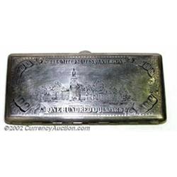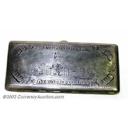 $100 Bill Cigarette Case. This full-size case is one of the more common varieties. The hinge and clasp operate perfectly, but the original spring is missing. Important notice: We expect to be auctioning lots at the rate of 200-250 per hour. Sometimes eBay Premier live bid software cannot keep up with that pace, so we strongly recommend that you place a realistic proxy bid now as insurance to avoid disappointment. Also please note that all Heritage/CAA lots purchased through eBay Premier carry a 20% Buyer's Premium. Please make sure you read the Terms and Conditions.