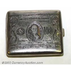 $100 Bill Cigarette Case. This half-size case is double thick, and it held cigarettes on both sides. The entire design is on the face of the case, the back being blank. The hinge and clasp are perfect, and both original internal springs are present. A scarcer case. Important notice: We expect to be auctioning lots at the rate of 200-250 per hour. Sometimes eBay Premier live bid software cannot keep up with that pace, so we strongly recommend that you place a realistic proxy bid now as insurance to avoid disappointment. Also please note that all Heritage/CAA lots purchased through eBay Premier carry a 20% Buyer's Premium. Please make sure you read the Terms and Conditions.