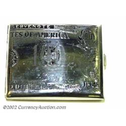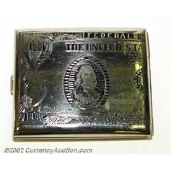 $100 Bill Cigarette Case. This half-size case is in beautiful shape, with the metal surfaces bright and shining, and only minor traces of use. The hinge, springs and internal clasps are all in perfect shape. Important notice: We expect to be auctioning lots at the rate of 200-250 per hour. Sometimes eBay Premier live bid software cannot keep up with that pace, so we strongly recommend that you place a realistic proxy bid now as insurance to avoid disappointment. Also please note that all Heritage/CAA lots purchased through eBay Premier carry a 20% Buyer's Premium. Please make sure you read the Terms and Conditions.