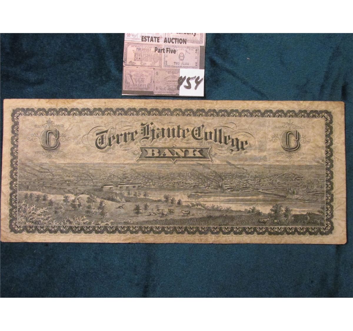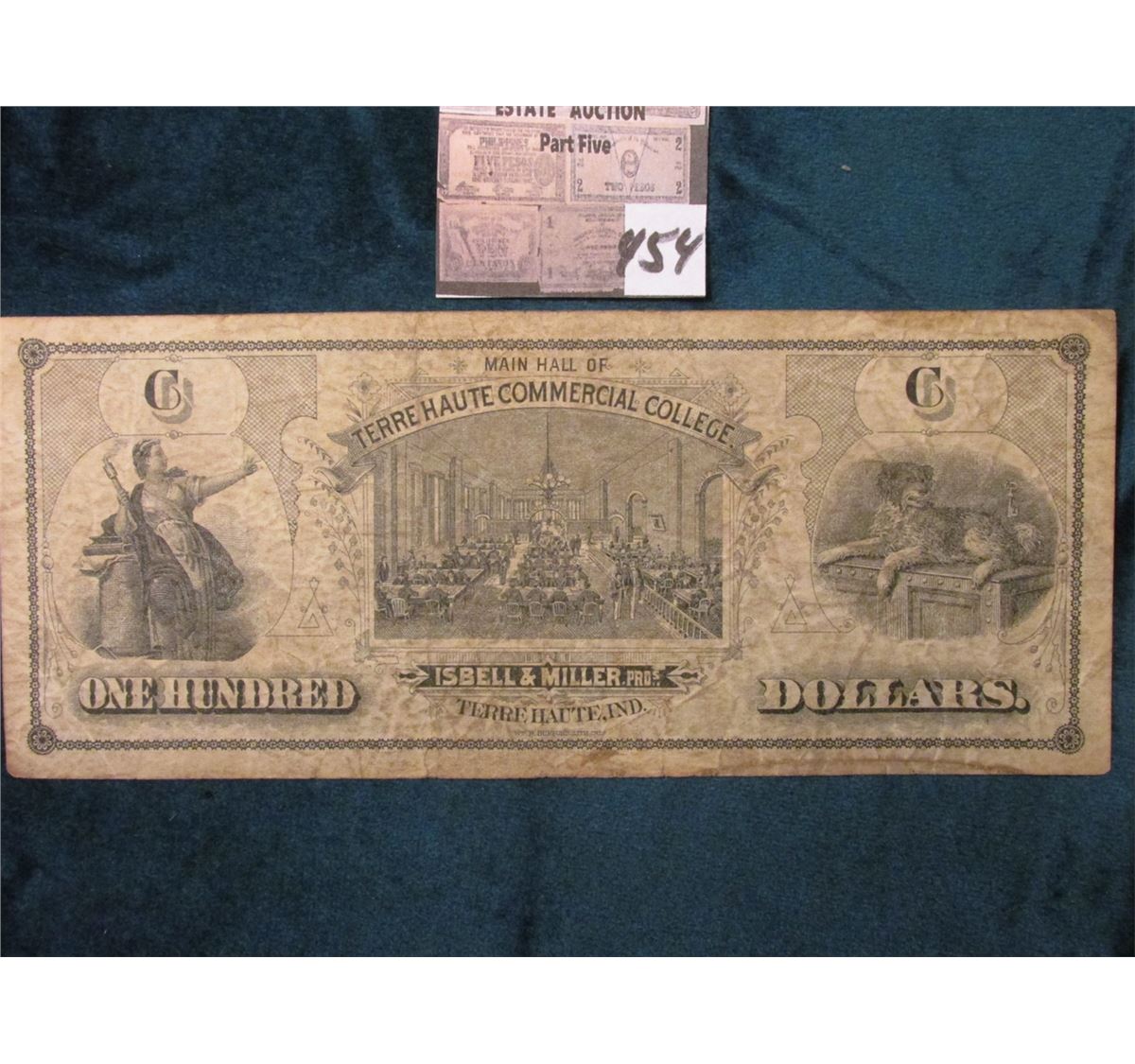 $100 "C" Note "Terre Haute College Bank" "Main Hall of Terre Haute Commercial College Isbell & Miller, Pros. Terre Haute, Ind." Depicts a woodcut lithograph of City. Rev. Woman left, dog right, Hall center.