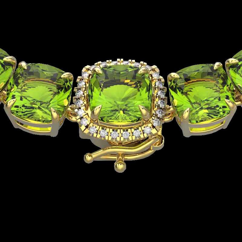 REF-528F9N -23355 ---- 100 CTW Peridot & VS/SI Diamond Halo Micro Solitaire Necklace 14K Yellow Gold ---- Luxury Designer Brand Necklace Appraised at $37,800 Certificate Number US23355 14k Yellow gold, Necklace Size is 16 Incehs, Necklace measuring approx. 9 mm x 16 Inches, weighing in total approx. 30 grams. Made in the USA and is stamped 14k, Main stone 99.75 carat total weight containing 49 pieces of Intense Green color with AAA quality Cushion shape cut Peridot , Stone #2 0.25 carat total weight containing 24 pieces of H-I color with VS/SI quality Round shape cut Diamond