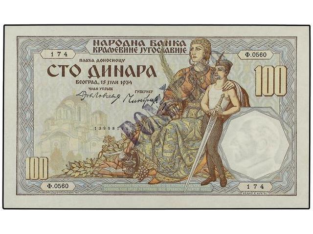 100 Dinaras. 15 Julio 1934. YUGOSLAVIA. ESPECIMEN. WPM-31. SC.