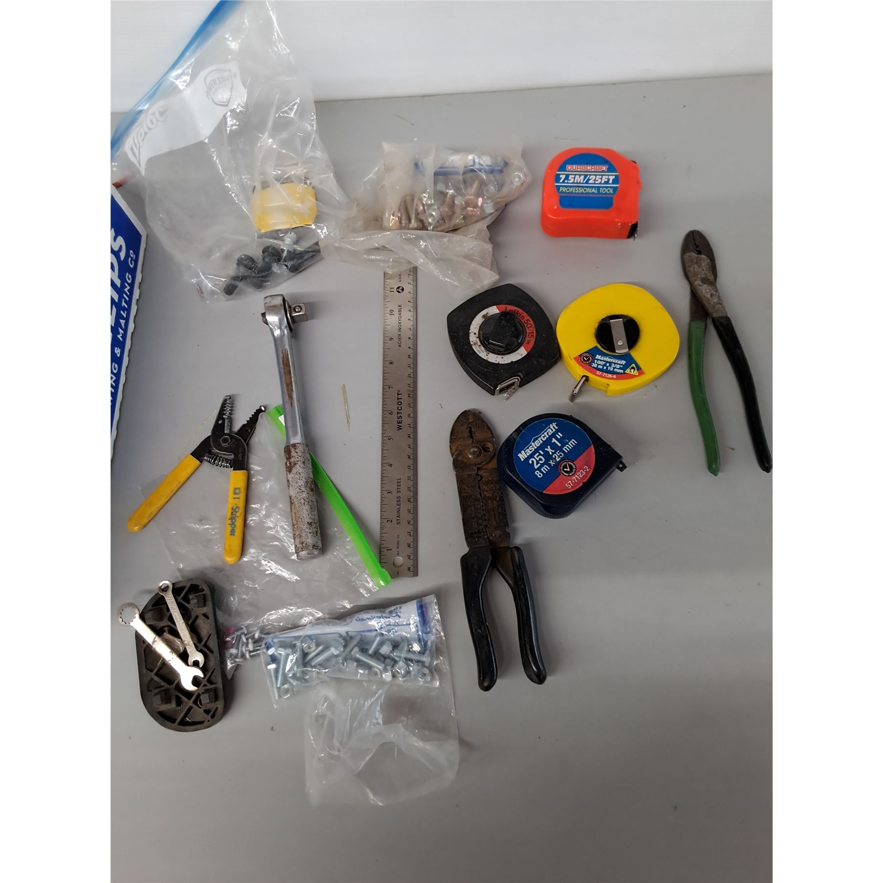 100 Ft Tape Measure, Ratchet, Nuts & Bolts, Misc.