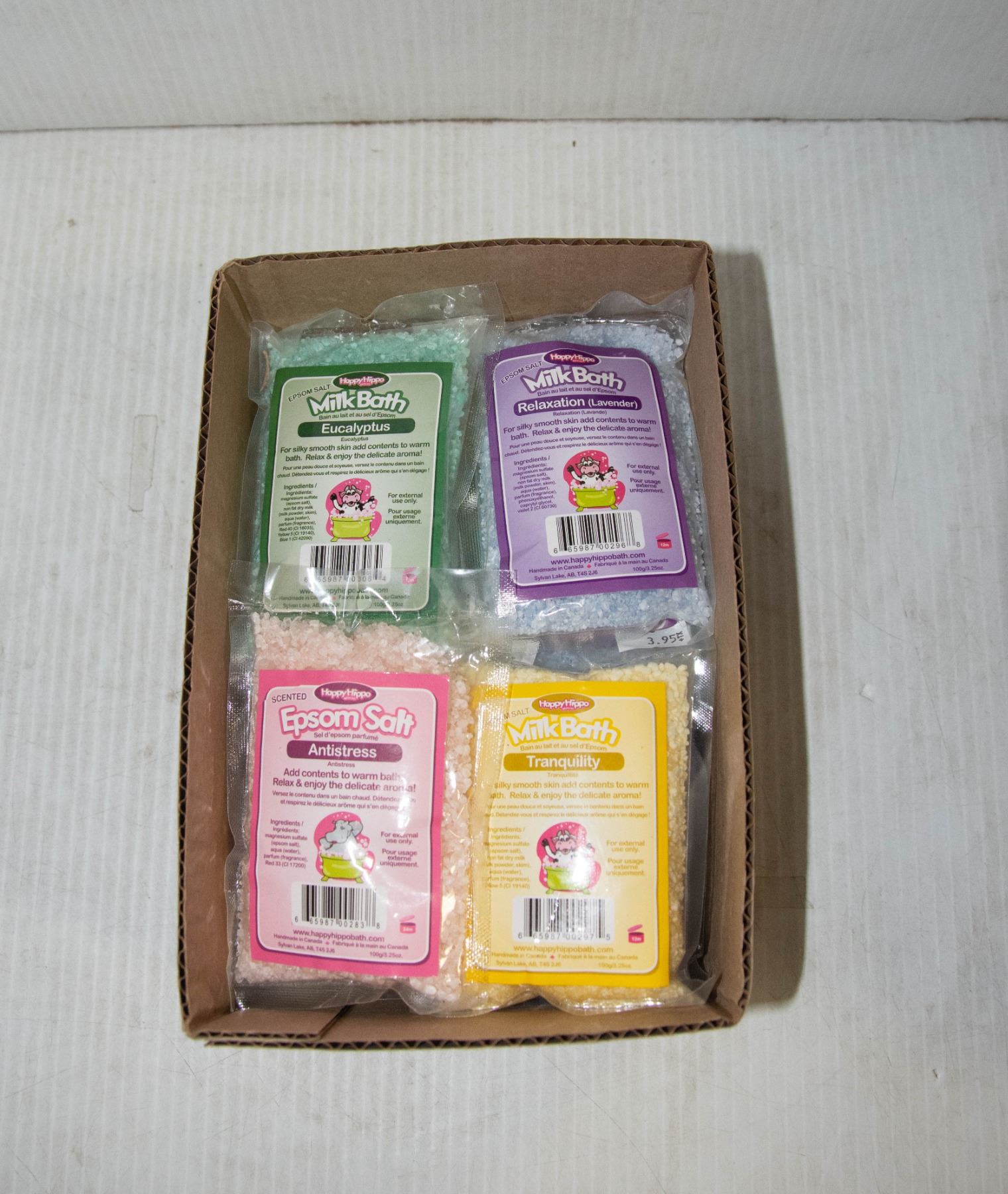 1 FLAT OF 16 INDIVIDUAL 100 GRAM PACKS OF HAPPY HIPPO MILK AND BUBBLE AND EPSOM BATH SALTS ASSORTED SCENTS OF HAWAIIAN SUNRISE HONEYDEW EUCALYPTUS RELAXATION (LAVENDER) TRANQUILITY VERY VANILLA ANTI-STRESS MANGO MANIA COTTON CANDY AND STRAWBERRIES**ALL ITEMS MUST BE REMOVED BY 5PM MONDAY, SEPTEMBER 17, 2022. ALL REMAINING ITEMS WILL BE SUBJECT TO A $6.00 PER DAY STORAGE CHARGE. ANY ITEMS REMAINING AFTER MONDAY, SEPTEMBER 17, 2022 WILL BE CONSIDERED FORFEITED. NO REFUNDS WILL BE ISSUED FOR FORFEITED ITEMS. TO SCHEDULE A PICK UP APPOINTMENT CLICK HERE