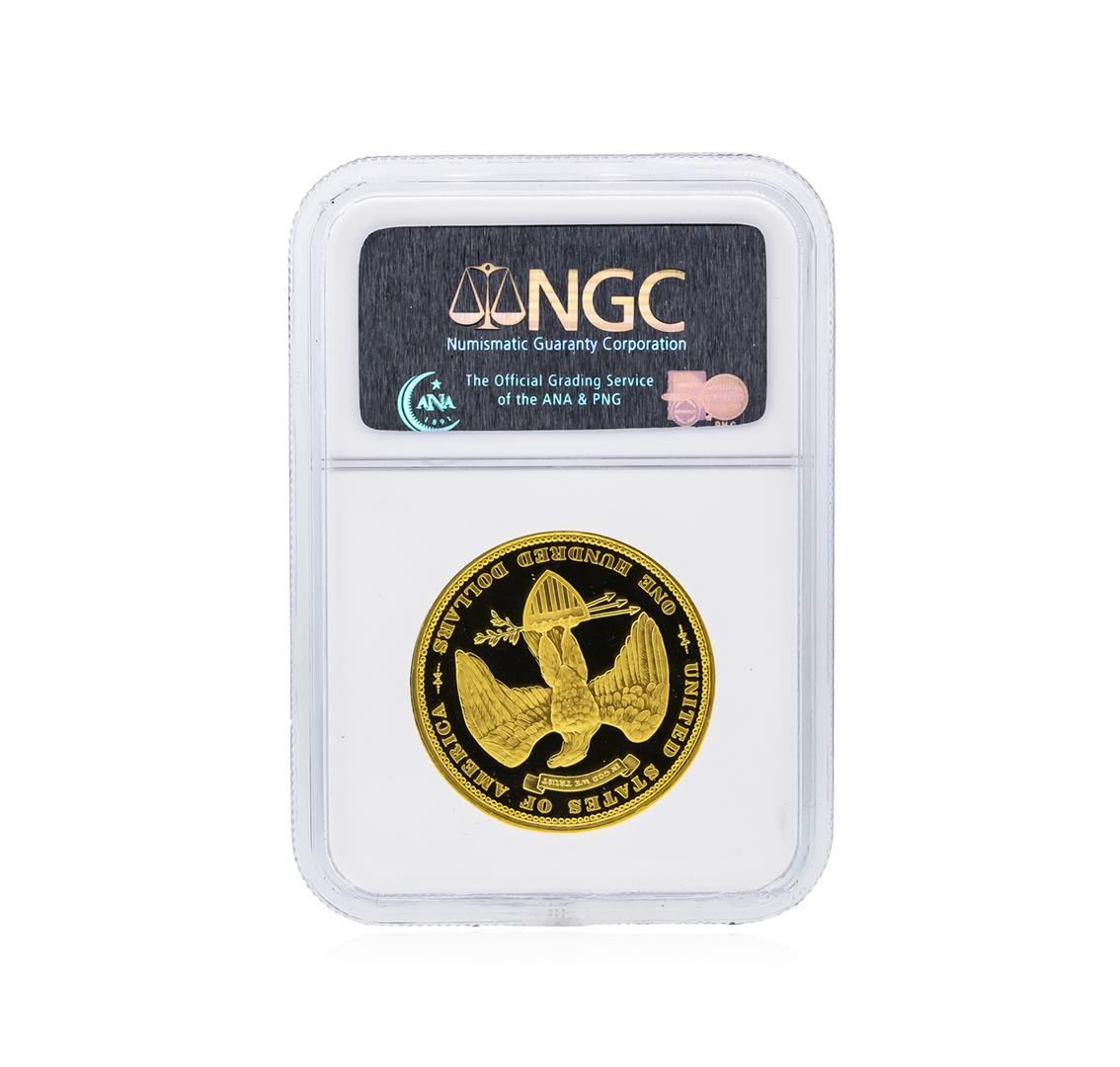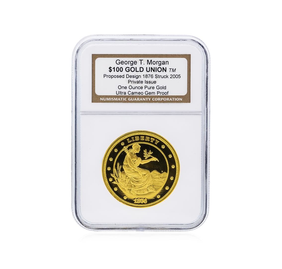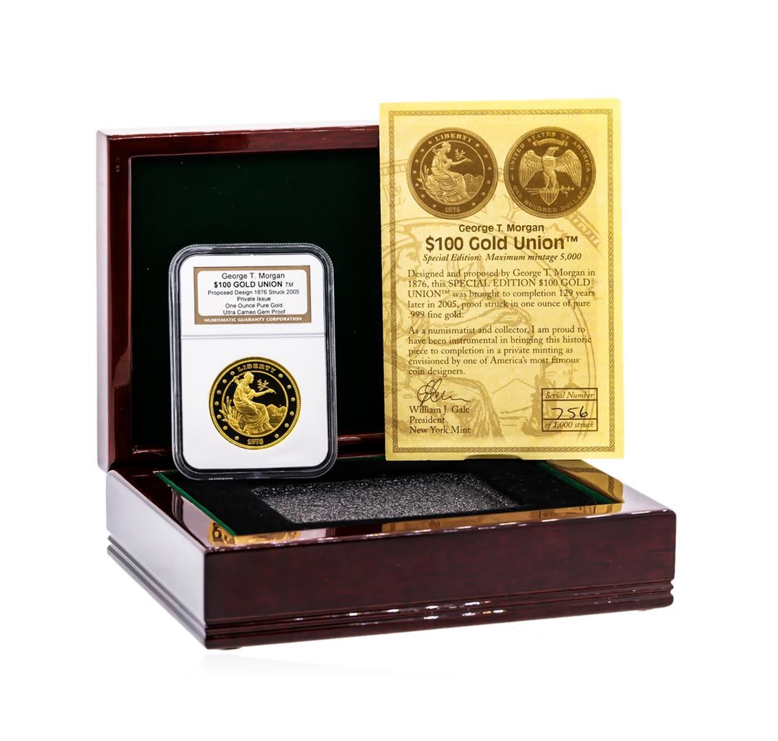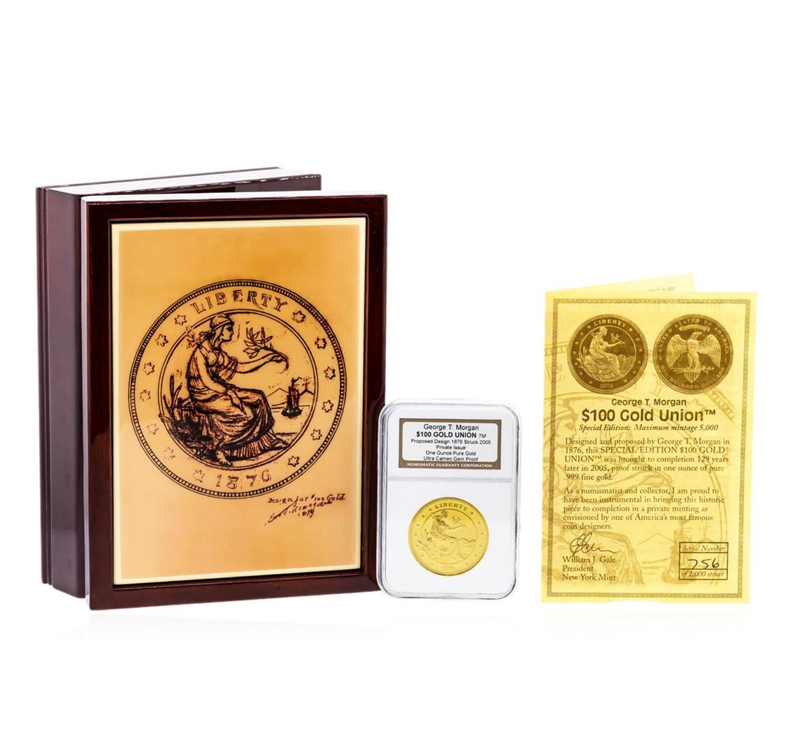 This NGC Graded Ultra Cameo Gem Proof $100 Gold Union Coin was designed and proposed by George T. Morgan in 1876, this special edition $100 Gold Union was brought to completion 129 years later in 2005, proof struck in one ounce of pure .999 fine gold. This is serial #756/1000 and comes complete with Wooden Box and Certificate of Authenticity.