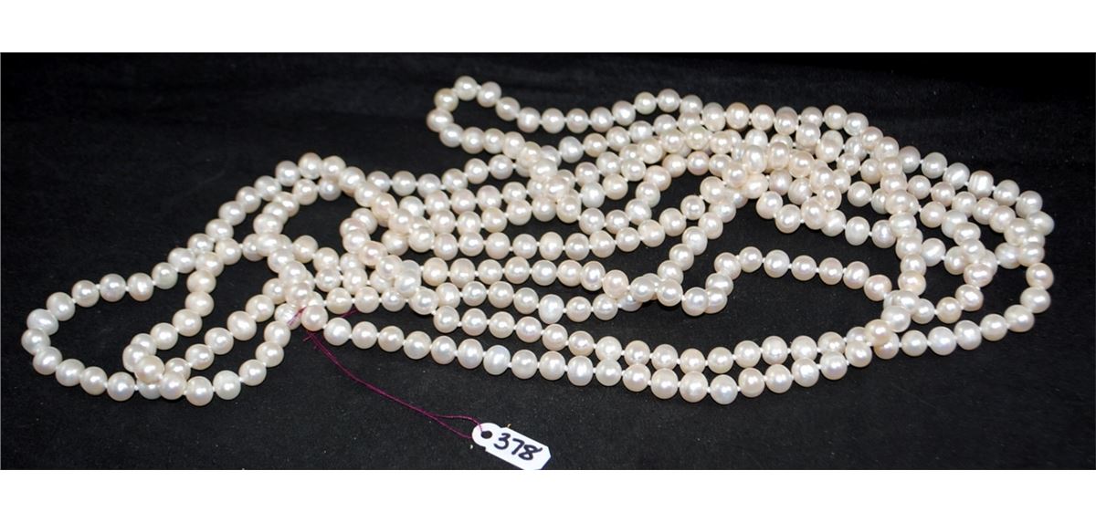 100 INCH LONG STRANDS OF PEARLS - INDIVIDUALLY KNOTTED WHITE PEARLS.