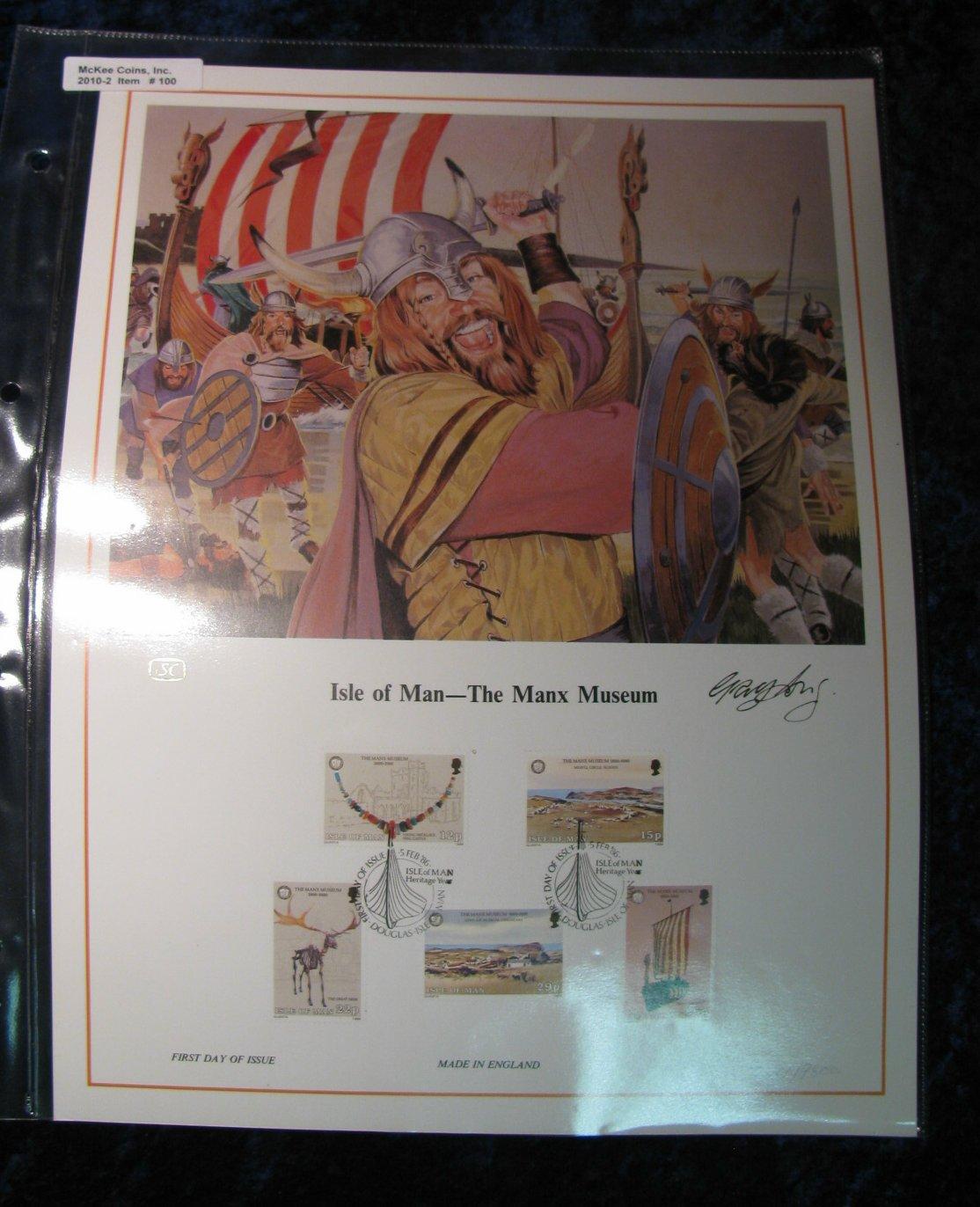 100. Isle of Man - The Manx Museum First Day of Issue Cover with illustration of a Viking battle. Mint condition. In plastic. Signed and numbered limited edition of 9,500.