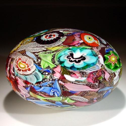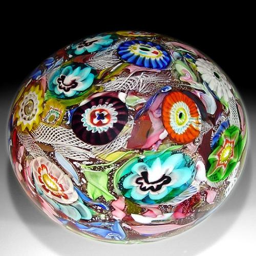 Italian super magnum hollow scrambled millefiori paperweight, composed of several large complete canes, scattered among segments of colorful twists and rods, white latticinio, and strands of gold aventurine, on silver-speckled red ground. Diameter 7 1/2". NO RESERVE