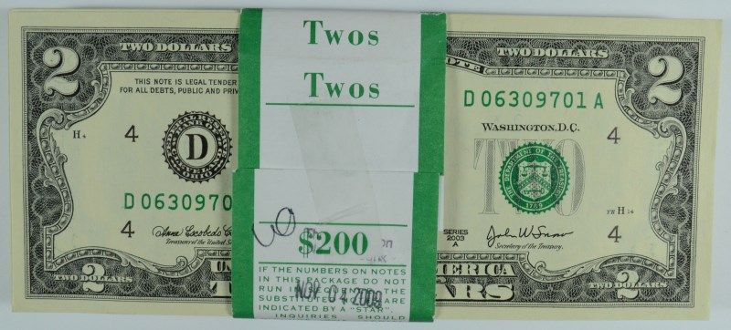 100 PIECES 2003-A $2.00 BILLS, ORIG. WRAP, CONSECUTIVE NUMBERS, UNCIRCULATED