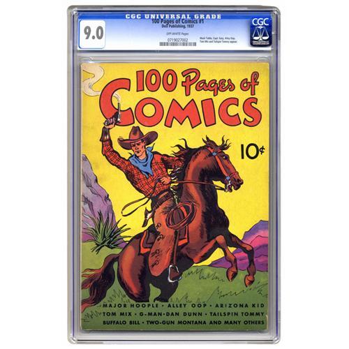 <B>100 Pages of Comics #1 (Dell, 1937) CGC VF/NM 9.0 Off-white pages.</B></I> Here's one we haven't had the chance to offer in any of our previous Heritage auctions -- a hefty square bound book of strip reprints. With a cover price of only 10¢, this comic must have been seen as a real bargain back in 1937! <I>Wash Tubbs</B></I>, <I>Captain Easy</B></I>, and <I>Alley Oop</B></I> appear alongside cowboy, detective, and adventure strip features. While the heavy paper covers look a little dingy, this seems to be due to the actual paper texture, rather than excessive dirt or wear. Overstreet 2006 VF/NM 9.0 value = $1,583; NM- 9.2 value = $2,100. CGC census 3/06: 1 in 9.0, 1 higher.